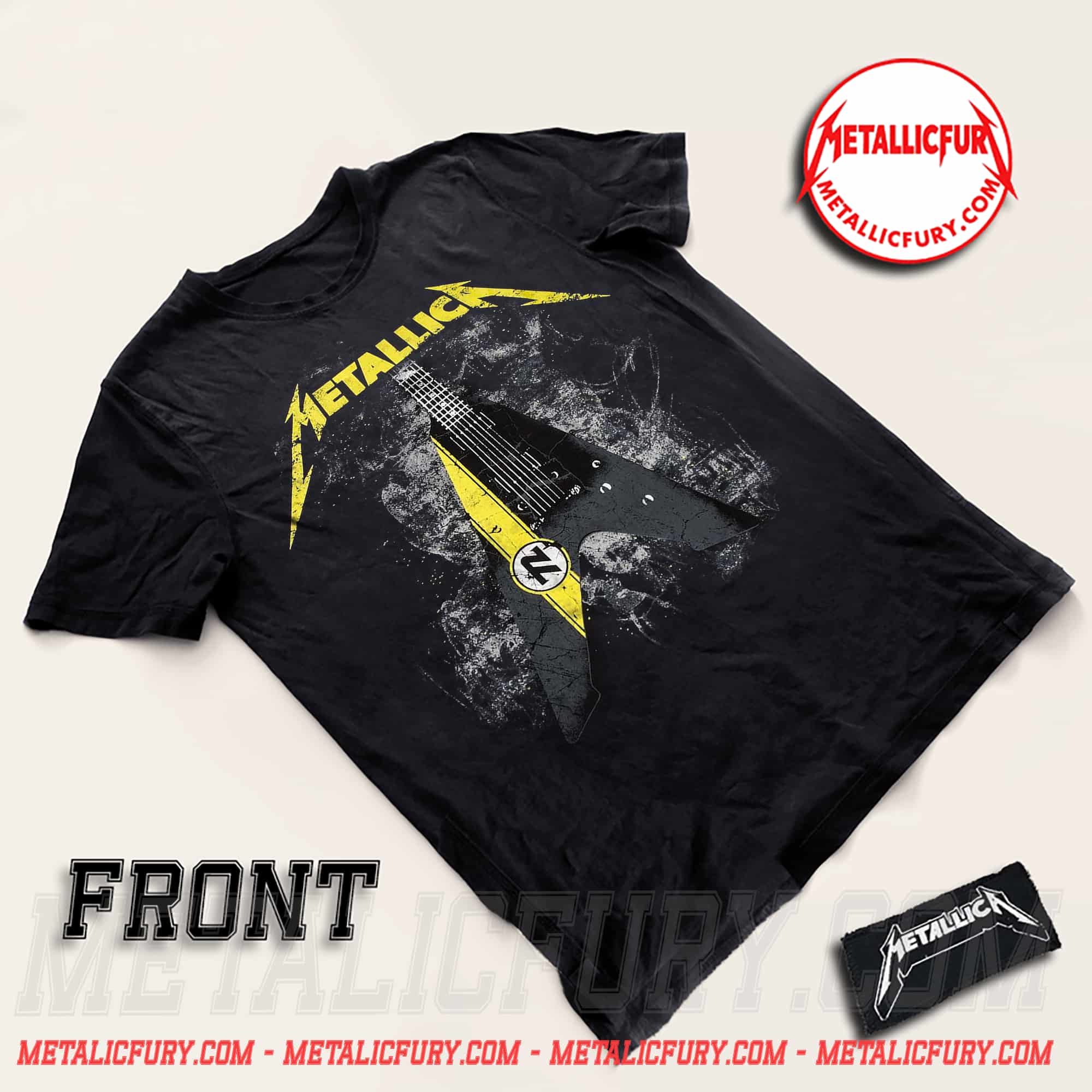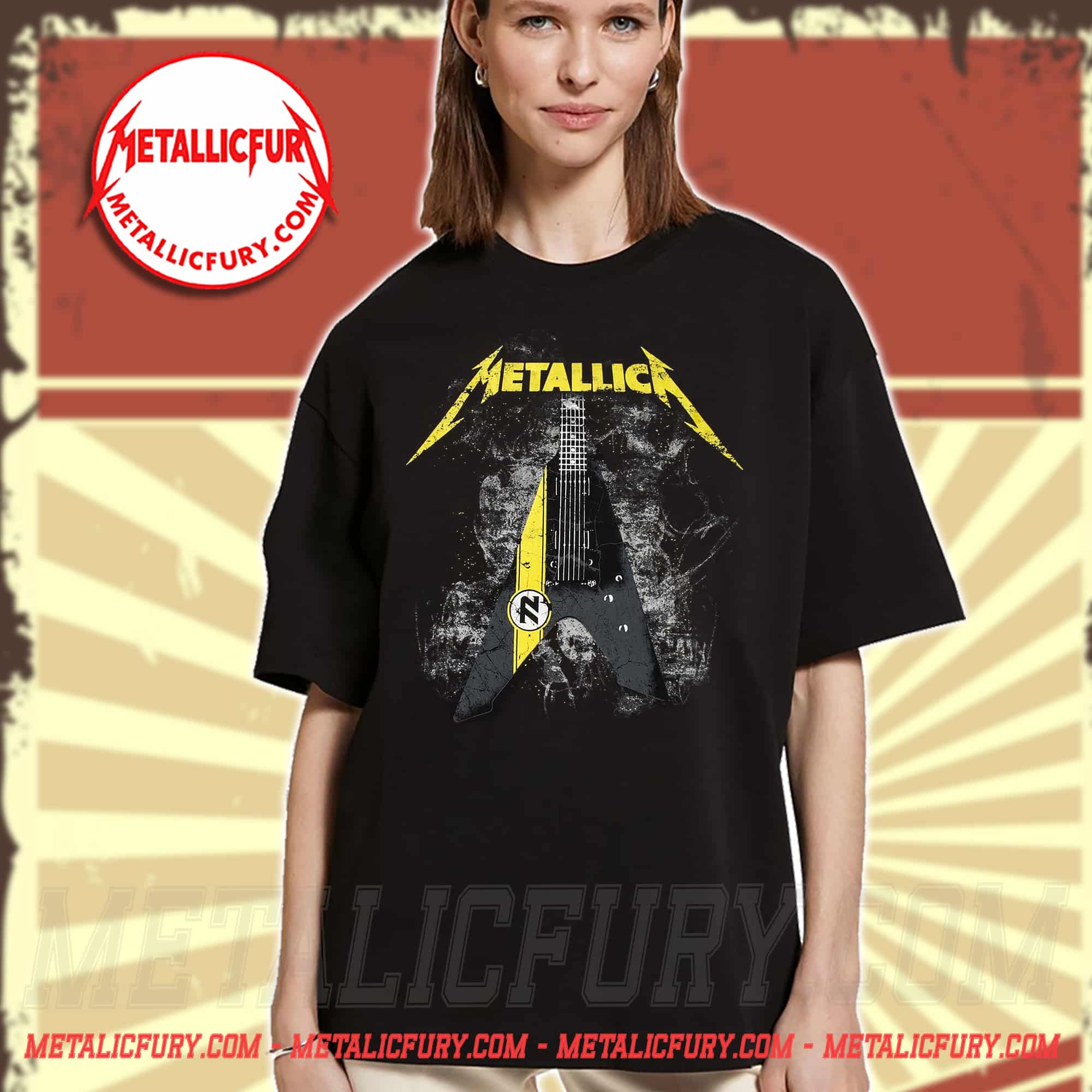 The heart of the design is the crisp graphic of the ESP Vulture guitar—the powerful weapon that has accompanied James Hetfield on countless massive stages. With its sharp, decisive V-shape, the guitar is the ultimate symbol of fast, aggressive, and uncompromising heavy metal. Every minute detail, from the fretboard to the signature circular logo on the body, is authentically reproduced. By wearing this tee, you directly pay tribute to the masterful rhythm guitar techniques and the commanding stage presence of “Papa Het.”