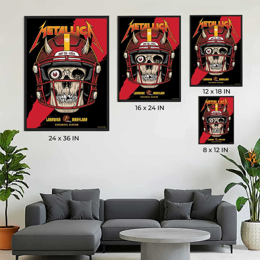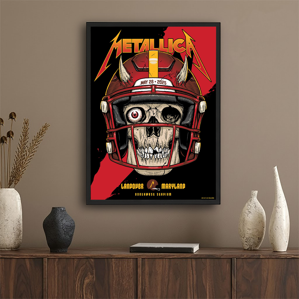 Metallica Landover Pop-Up Shop Poster – Northwest Stadium – May 28, 2025 – Artwork by Ian Williams is a powerful, venue-specific piece of artwork created exclusively for Metallica’s Pop-Up Shop in Landover, Maryland during the band’s 2025 tour. More than just a concert poster, this design stands as a bold visual statement that fuses heavy metal culture with the iconic sports identity of the local area.