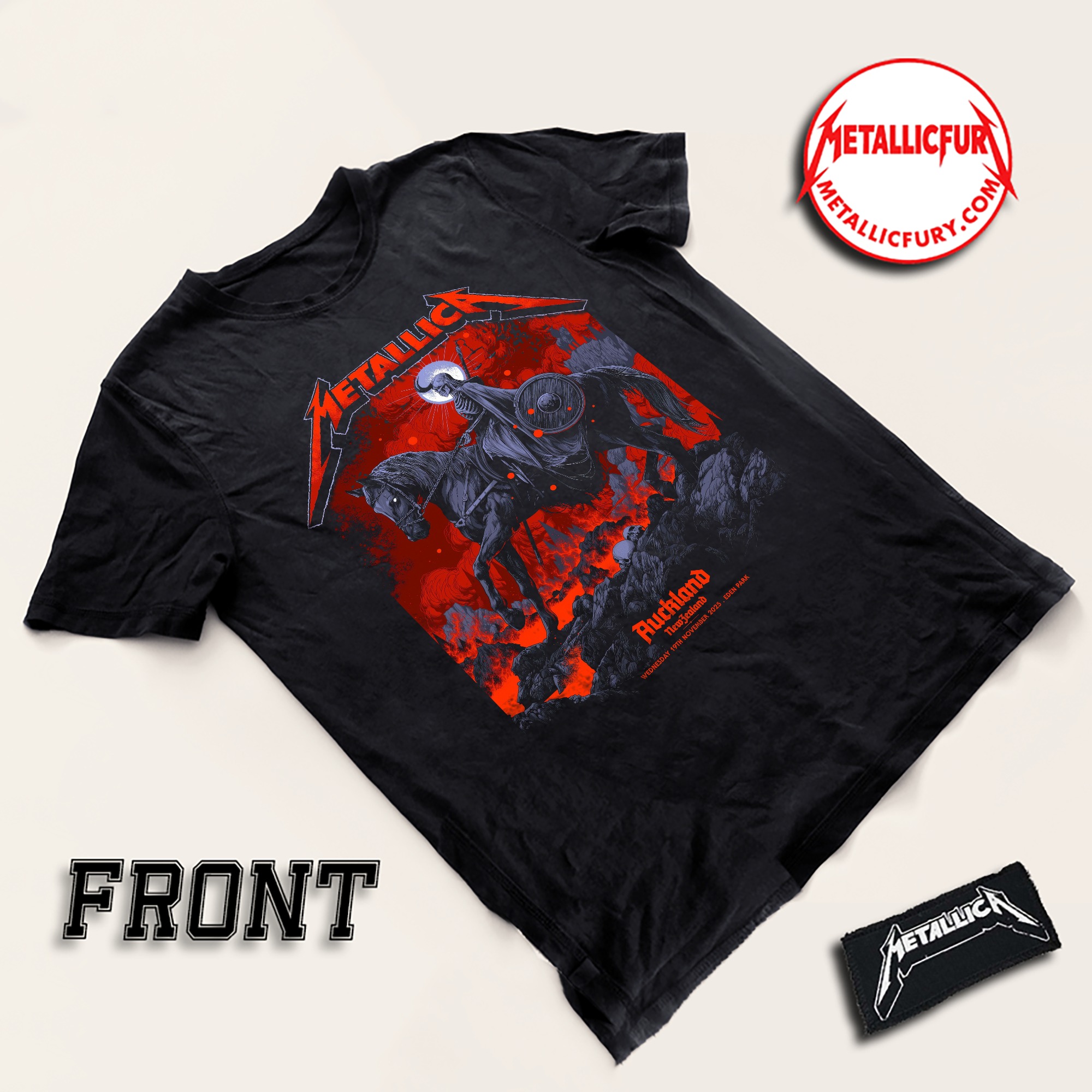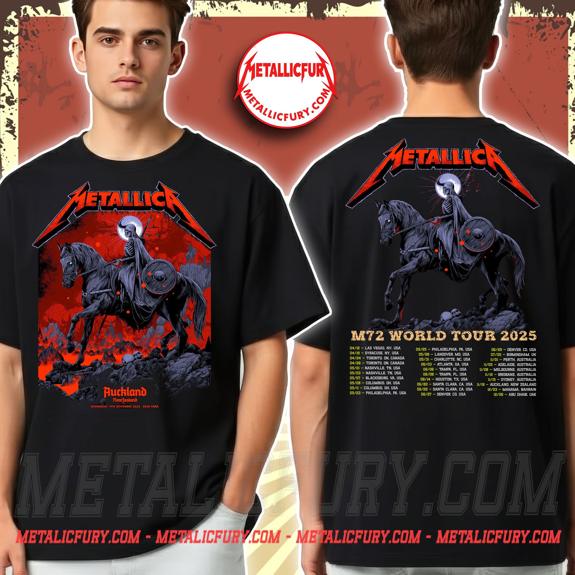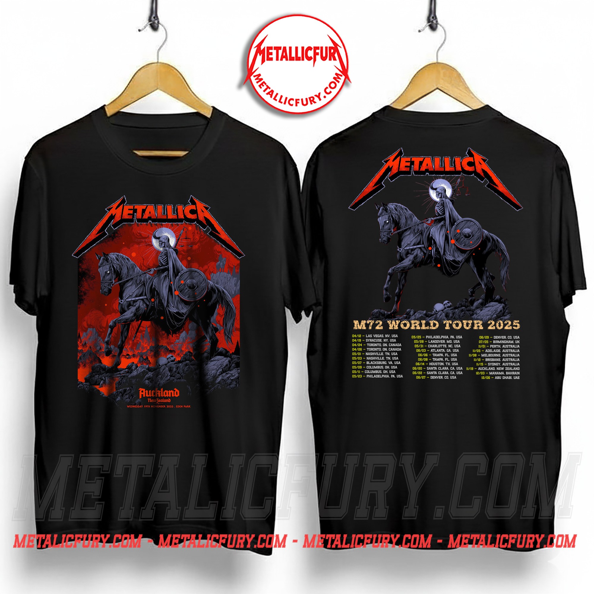 The Metallica M72 Auckland Pop-Up T-Shirt captures the dark atmosphere of the November 19, 2025 show at Eden Park, New Zealand. It’s designed for fans who prefer to buy online instead of standing in long merch lines, offering a striking piece of tour merch inspired by the energy and visual style of the M72 Tour.