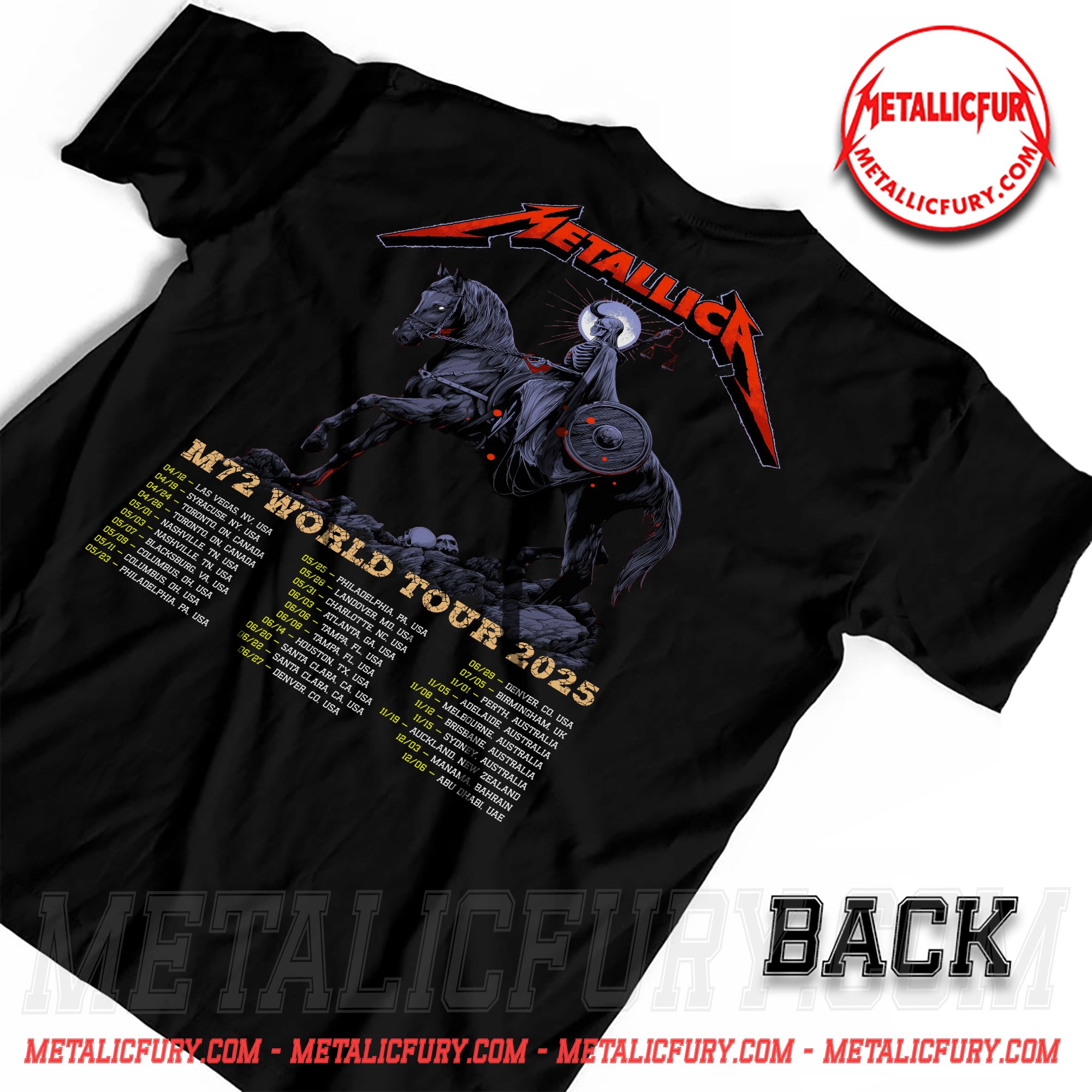 The front of the shirt features a dramatic scene of a rider on a black horse set against a vivid red sky. The composition delivers a powerful and mysterious tone with a cinematic feel that fits perfectly with Metallica’s signature visual aesthetic.