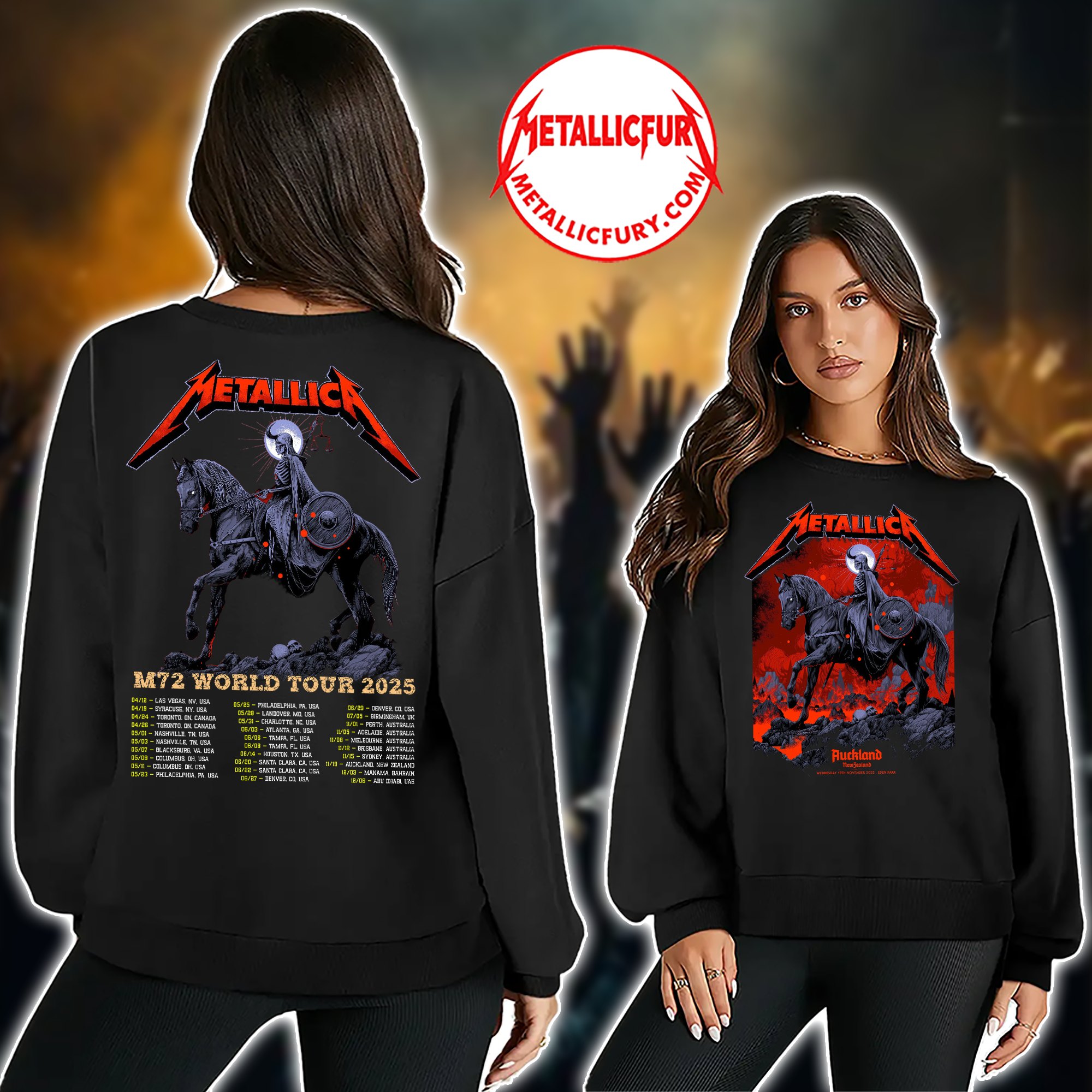 The back of the sweater continues the bold layout with a gray-toned warrior and a complete list of M72 World Tour 2025 stops. This makes the sweater not only a fashion statement but also a collectible keepsake for Metallica fans worldwide. The tour list is printed clearly and won’t smudge, turning the sweater into a historic item marking the biggest music journey of 2025.