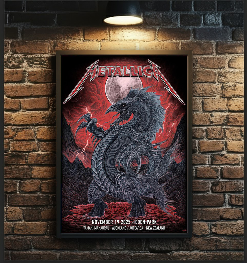 The official Metallica poster for the Eden Park, Auckland (2025) show is a visually powerful masterpiece. It features a legendary creature – inspired by the Taniwha of Māori culture – rising proudly amid a chaotic and dramatic landscape.