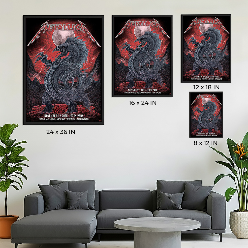 Celebrate the explosive Metallica show in New Zealand with the official poster from the M72 concert at Eden Park on November 19, 2025. This striking visual piece is designed for fans who want to own a valuable merch item commemorating the Auckland leg of the tour.