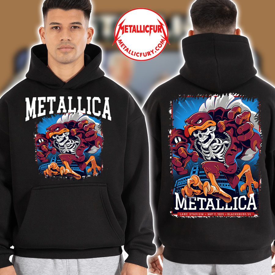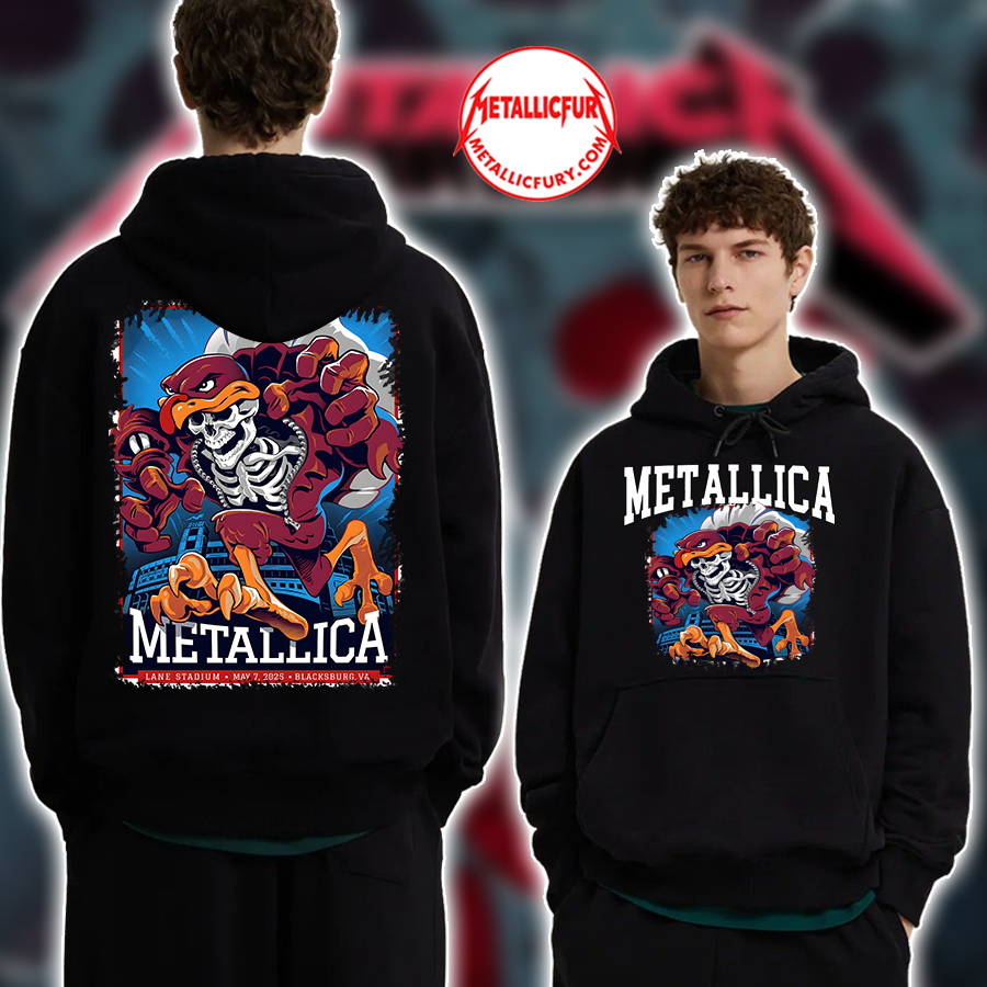 This hoodie was developed exclusively for the Blacksburg show, where Metallica fused their signature heavy metal art style with Virginia Tech’s HokieBird mascot. Every detail—from the iconic Metallica logo to the electrifying HokieBird skeleton illustration—captures both the power of metal and the spirit of Hokie Nation.