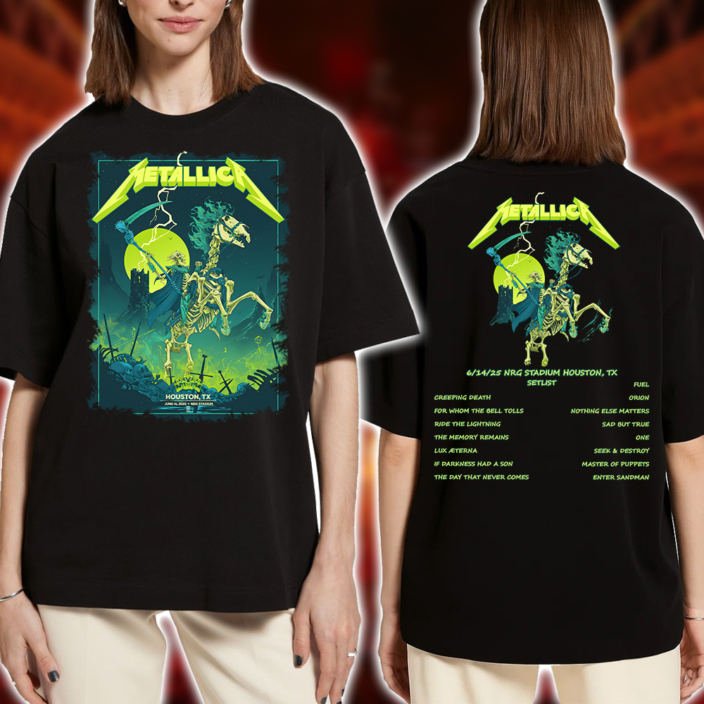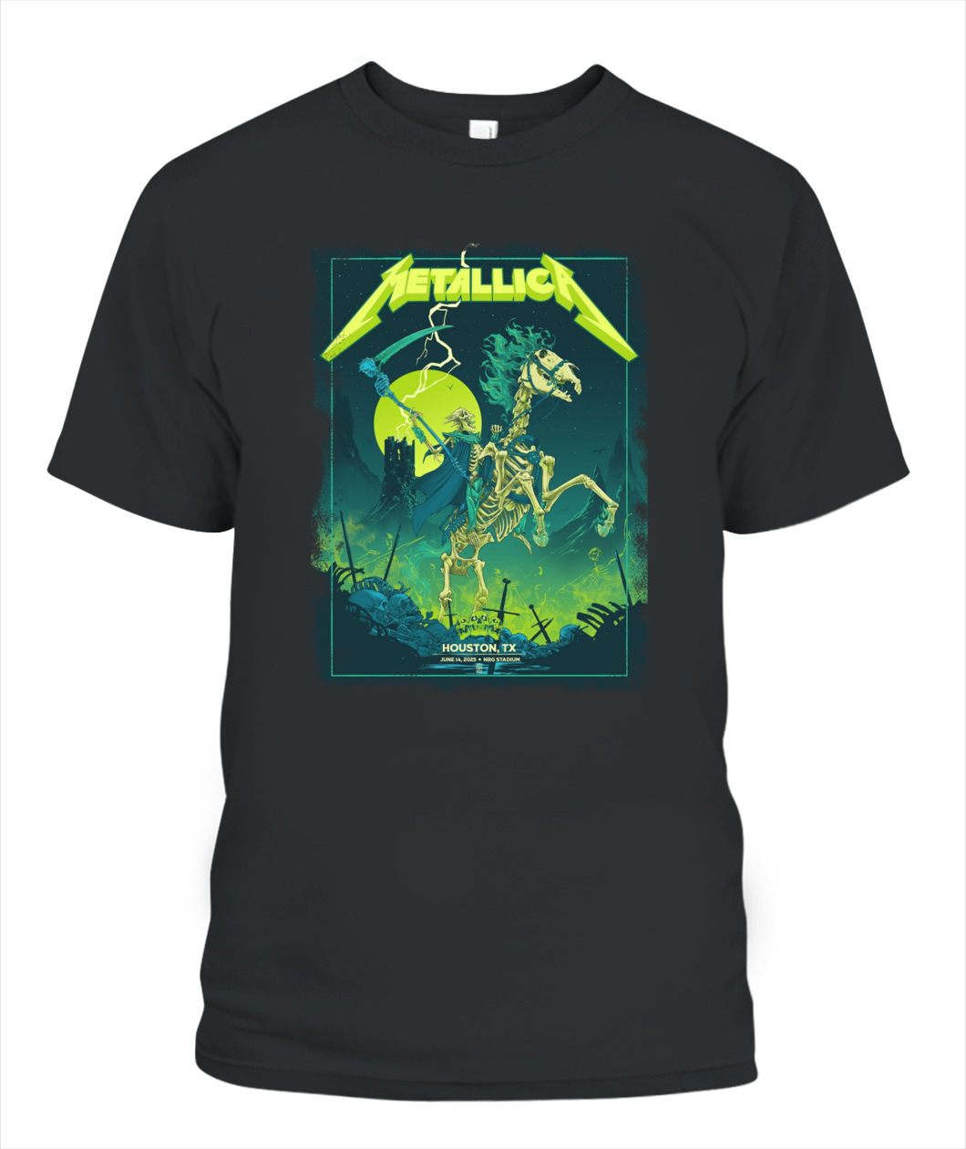 Metallica’s 2025 M72 World Tour made a powerful stop at NRG Stadium in Houston on June 14, 2025, with thousands of fans experiencing a night of electrifying energy and heavy riffs. To celebrate this historic event, the exclusive Metallica Houston Shirt 2025 was released. Unlike generic tour merch, this shirt features a stunning Grim Reaper horseman design charging through a fiery Houston skyline, along with the concert’s date and venue. Its limited availability makes it a prized item for collectors and die-hard fans alike.