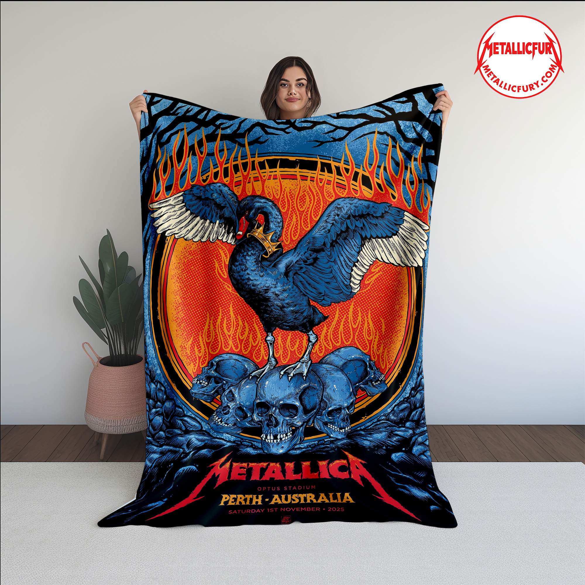 Designed by Ben Brown, one of Australia’s most renowned rock-art illustrators, this blanket features a dramatic black swan motif—a symbol deeply tied to Western Australia. With bold lines, dark energy, and tour-inspired visual storytelling, the artwork blends Metallica’s signature intensity with Perth’s iconic emblem.