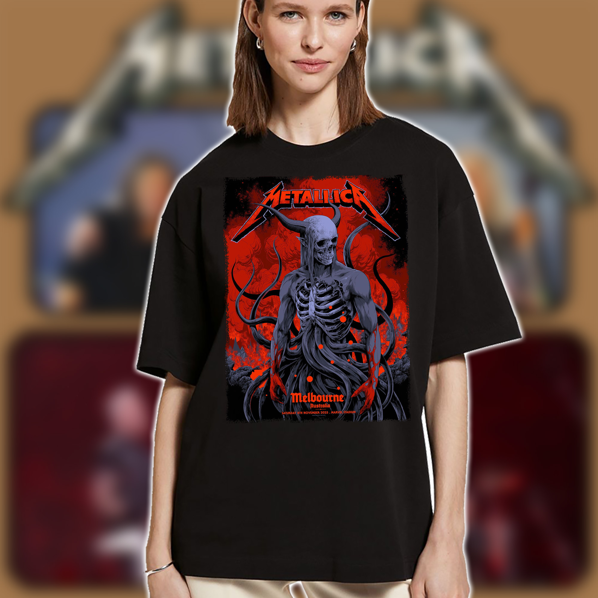 The artwork on the shirt is an official design by the legendary artist Ken Taylor, known for his striking poster illustrations and collaborations with iconic rock bands. The central image features a skeletal figure entwined with dark, fiery tentacles — symbolizing the intensity, rebellion, and immortal energy of Metallica. The band’s logo burns brightly above, while the word “Melbourne” below marks the historic concert night at Marvel Stadium on November 8, 2025.