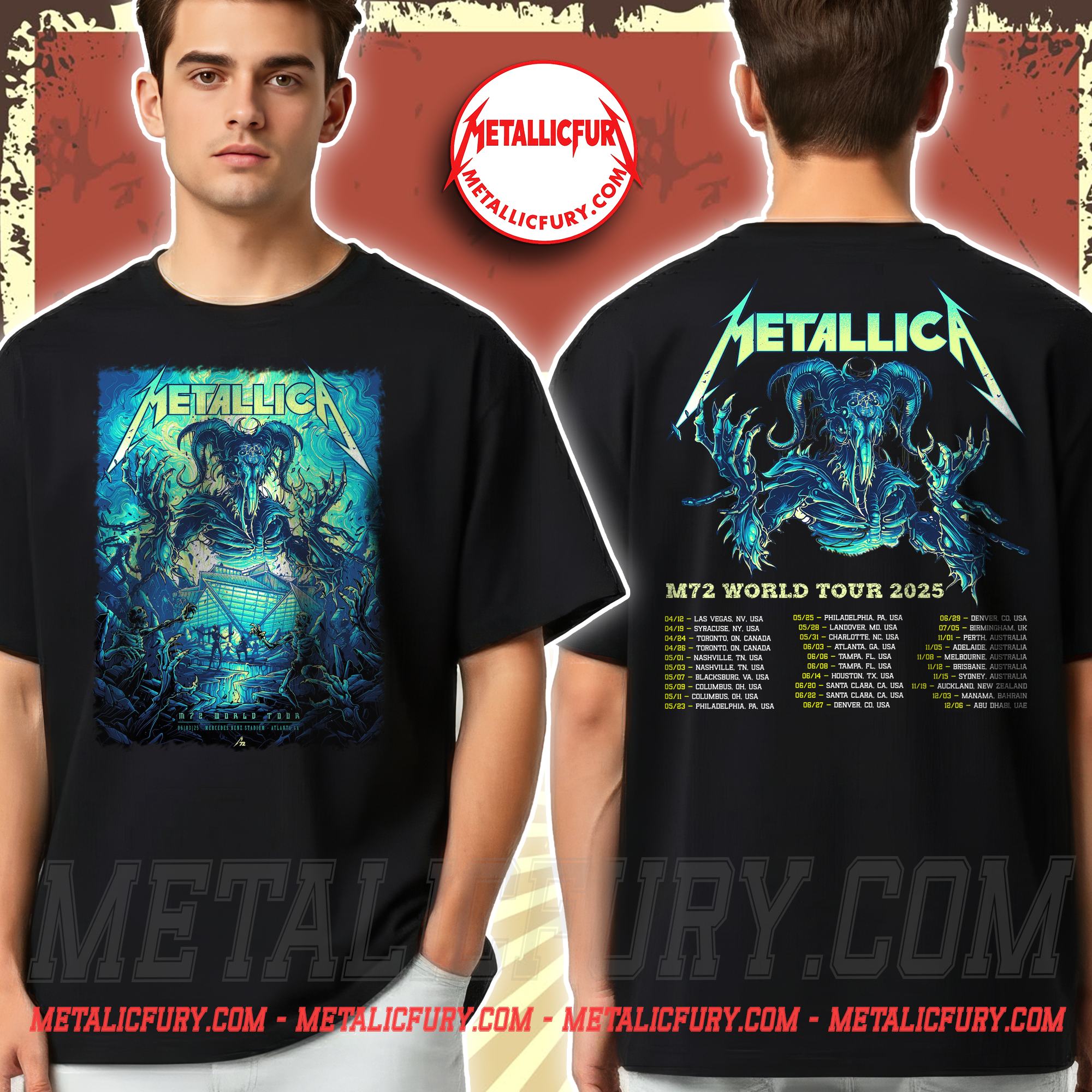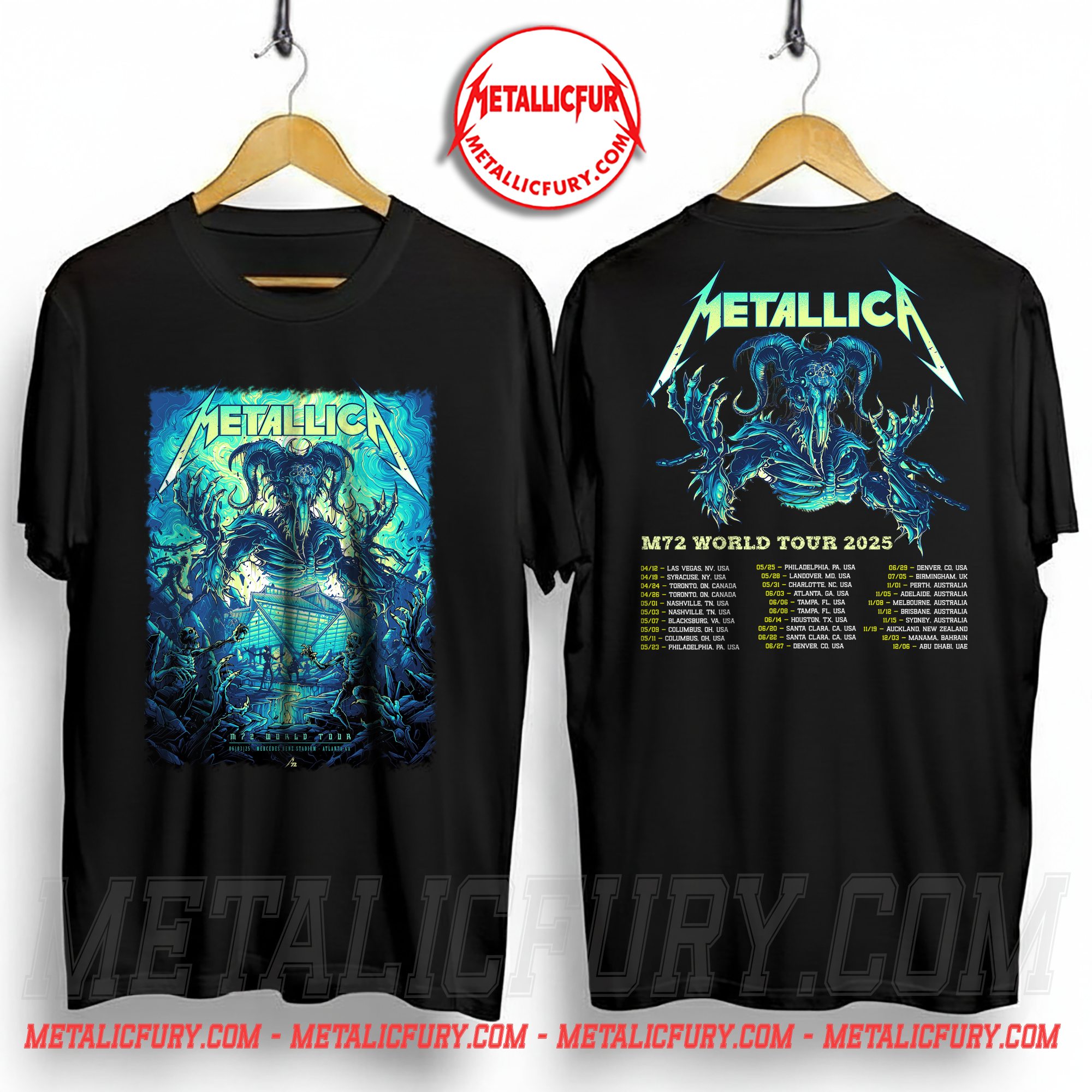 The Metallica M72 Tour Atlanta Pop-Up Shop Two-Sided T-Shirt is one of the most sought-after pieces of official tour merchandise from Metallica’s powerful stop at Mercedes-Benz Stadium in Atlanta, Georgia. More than just a concert T-shirt, this design represents a limited-edition collectible created for true fans of Metallica and the legendary M72 World Tour 2025.