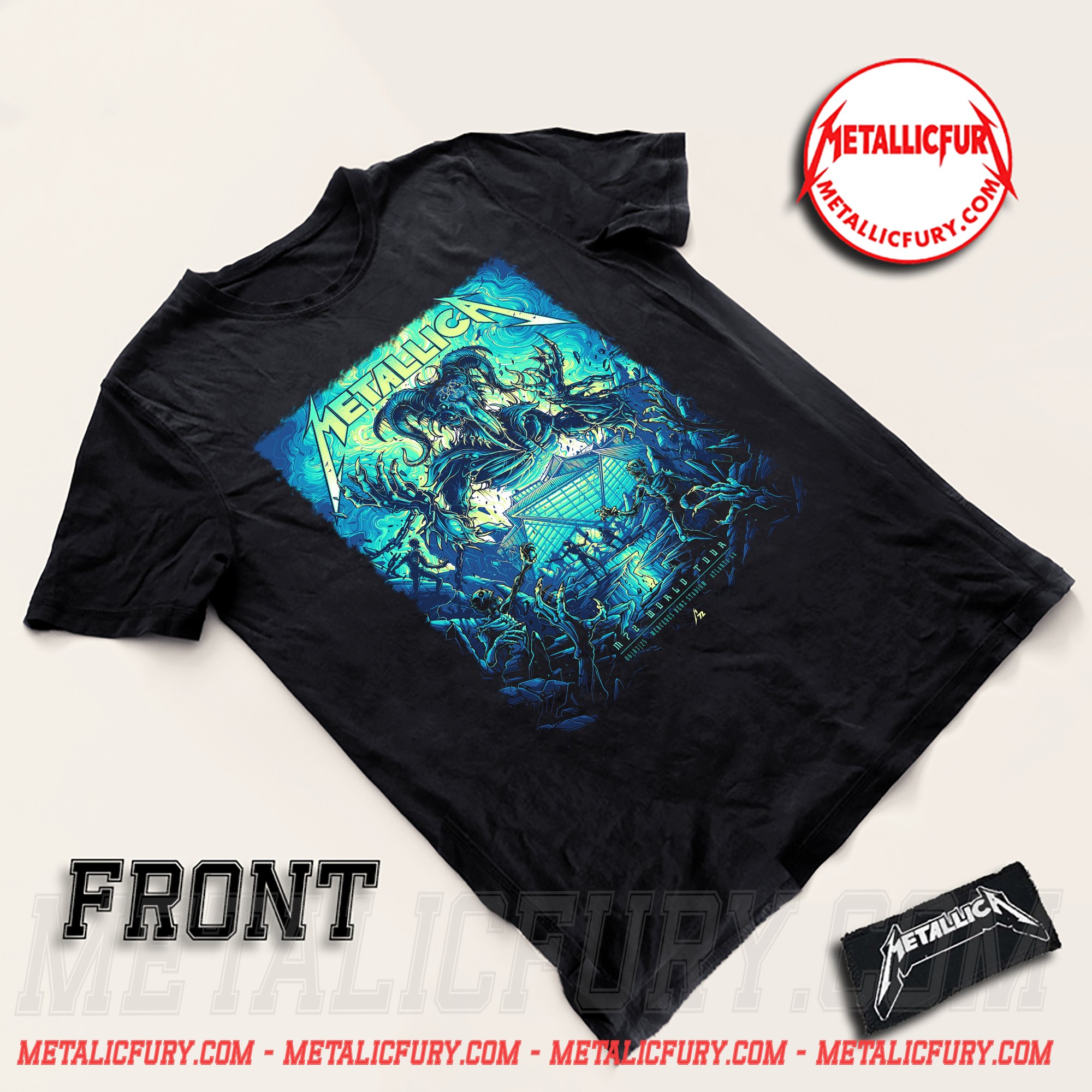 What makes this T-shirt truly stand out is its two-sided design, featuring exclusive artwork by Dan Mumford, a world-renowned artist known for his dark fantasy and highly detailed metal illustrations. The front graphic showcases a fearsome mythological creature rendered in striking blue and teal tones, surrounded by intense, swirling energy and architectural elements. This bold composition perfectly captures the raw aggression, mystery, and power that define Metallica’s sound and stage presence.