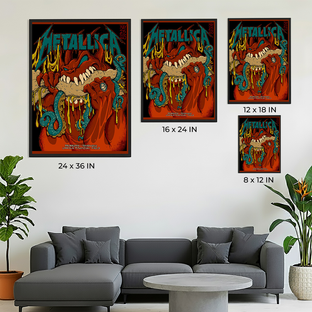 Concert posters are more than decoration; they are assets. Squindo’s work for Metallica is highly collectible due to his long history with the band (dating back to the 90s). This specific design stands out due to its specific cultural reference to the Philadelphia food scene, making it a unique conversation piece that differentiates it from generic tour art.