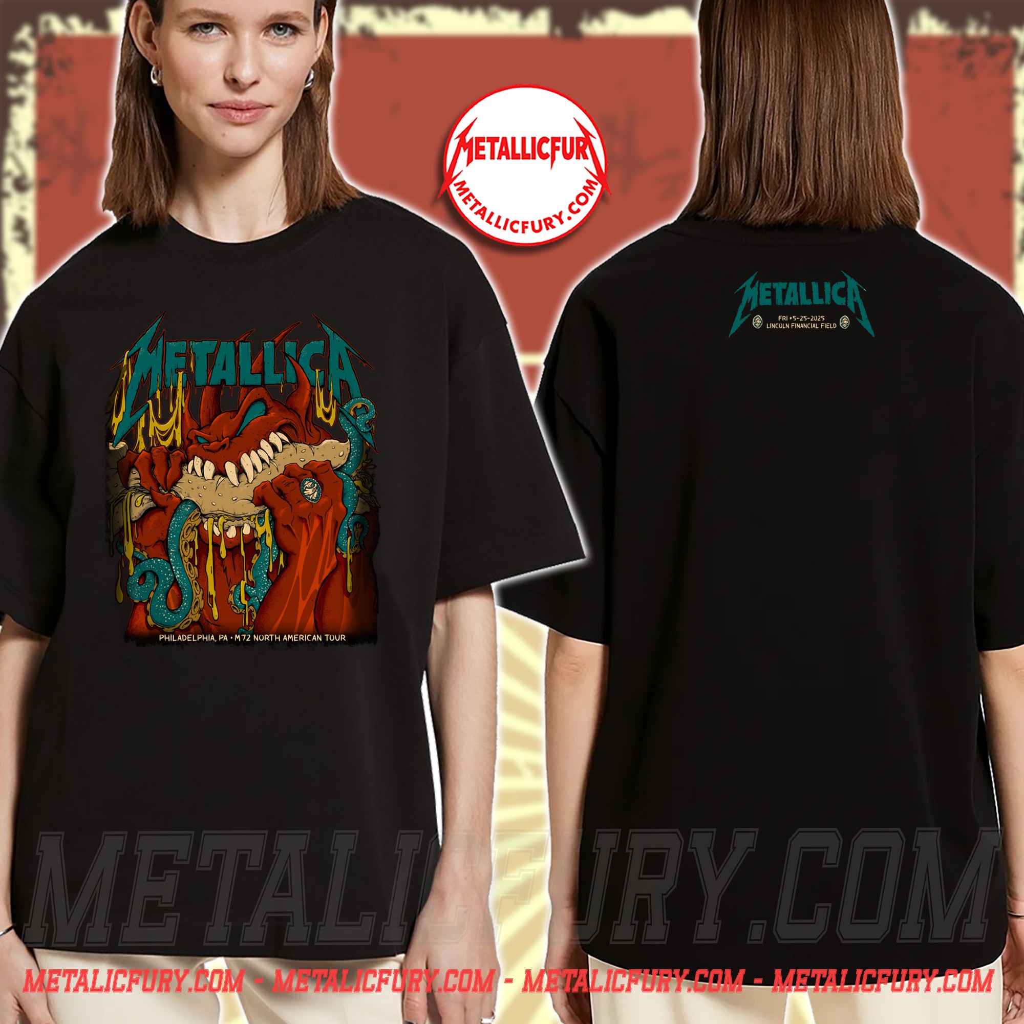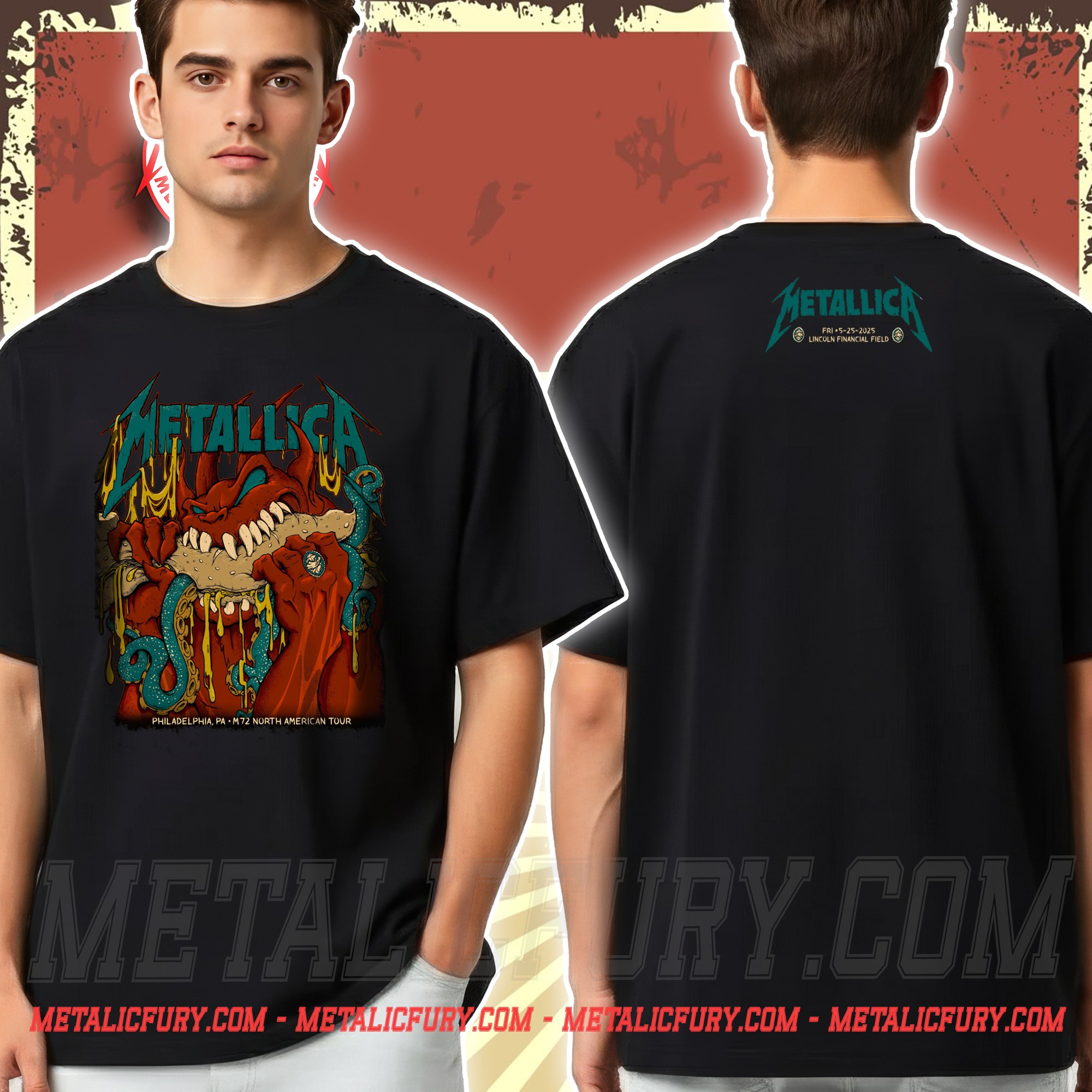 The attention to detail is visceral. The creature grips the sandwich with primal force, while molten cheese drips down like toxic sludge, blending the city’s culinary fame with the aggressive, high-octane spirit of Metallica. The vibrant teal and red color palette pops against the black fabric, making the “METALLICA” logo and the “M72 North American Tour” branding unmistakably clear. This is the kind of artwork that turns heads and sparks conversations, embodying the chaotic fun of the M72 Snake Pit.