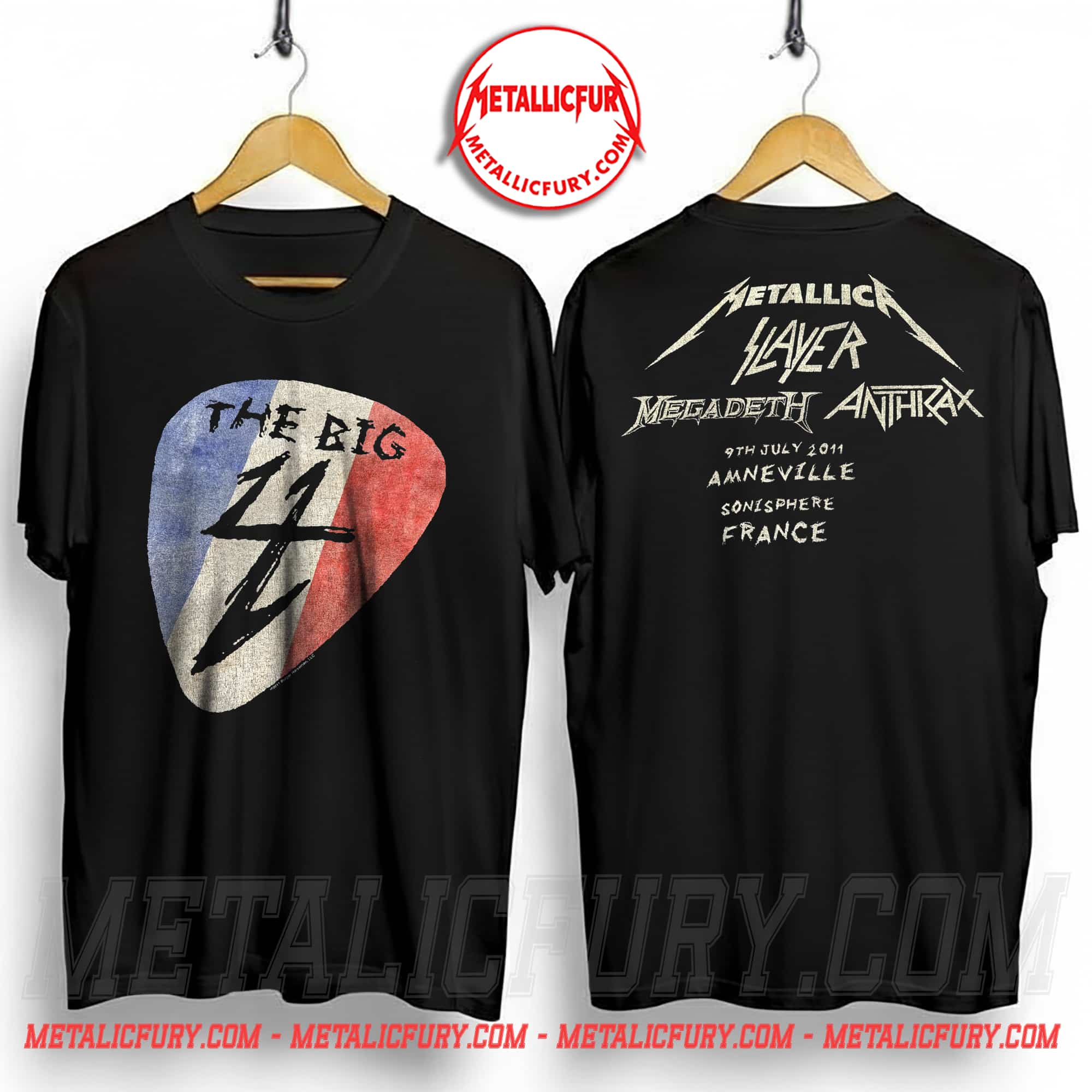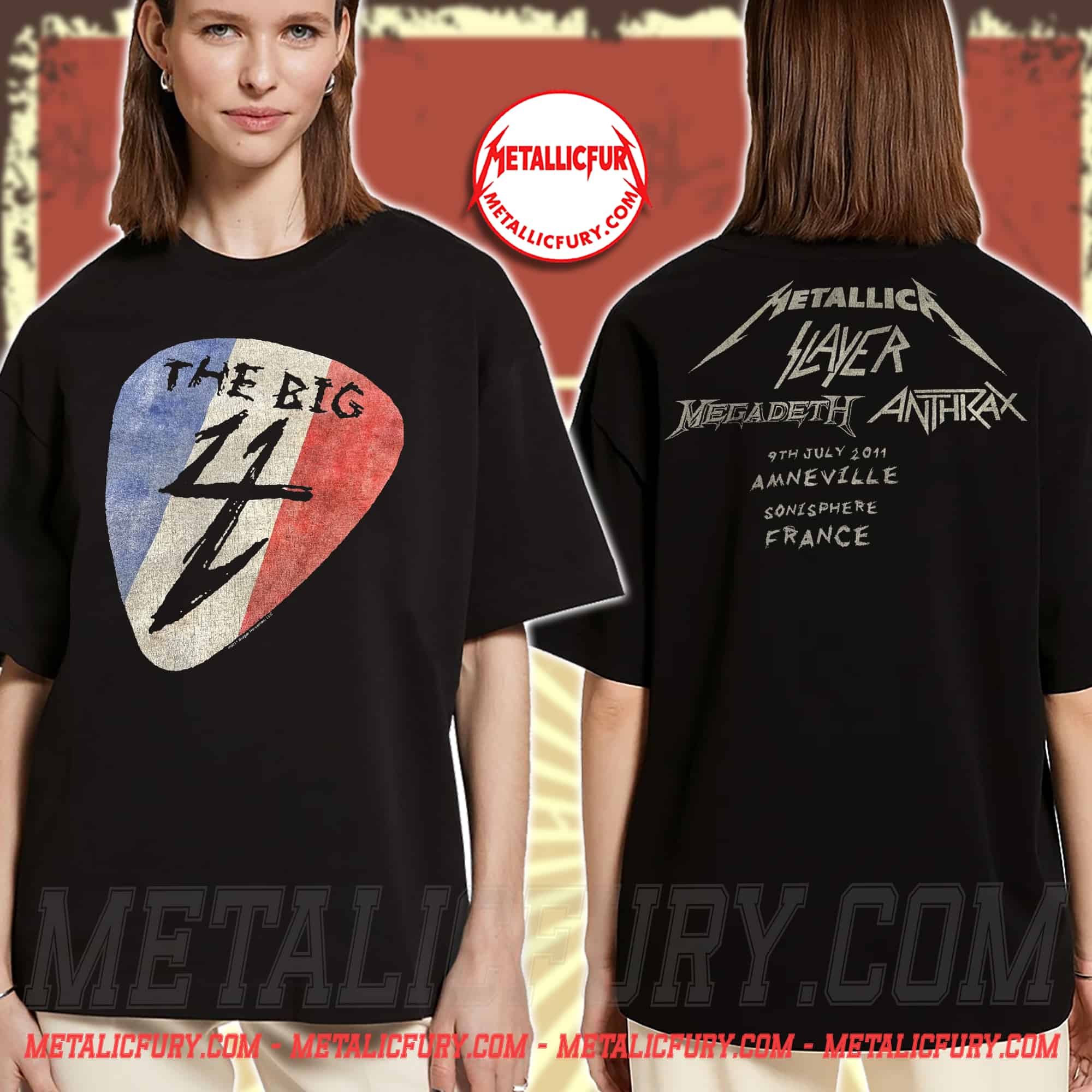 The front of the shirt features a giant guitar pick – the soul of the high-speed “down-picking” technique that defines the Thrash Metal sound. The pick incorporates the Blue – White – Red colors inspired by the French flag (Tricolore), paired with a stylized number “4” shaped like a sharp lightning bolt, evoking the golden era of 80s Metal. The back of the shirt is the pride of any metal fan: the logos of the four bands arranged in their performance order, along with rough, hand-drawn text marking the exact location and date of this historic Sonisphere event.