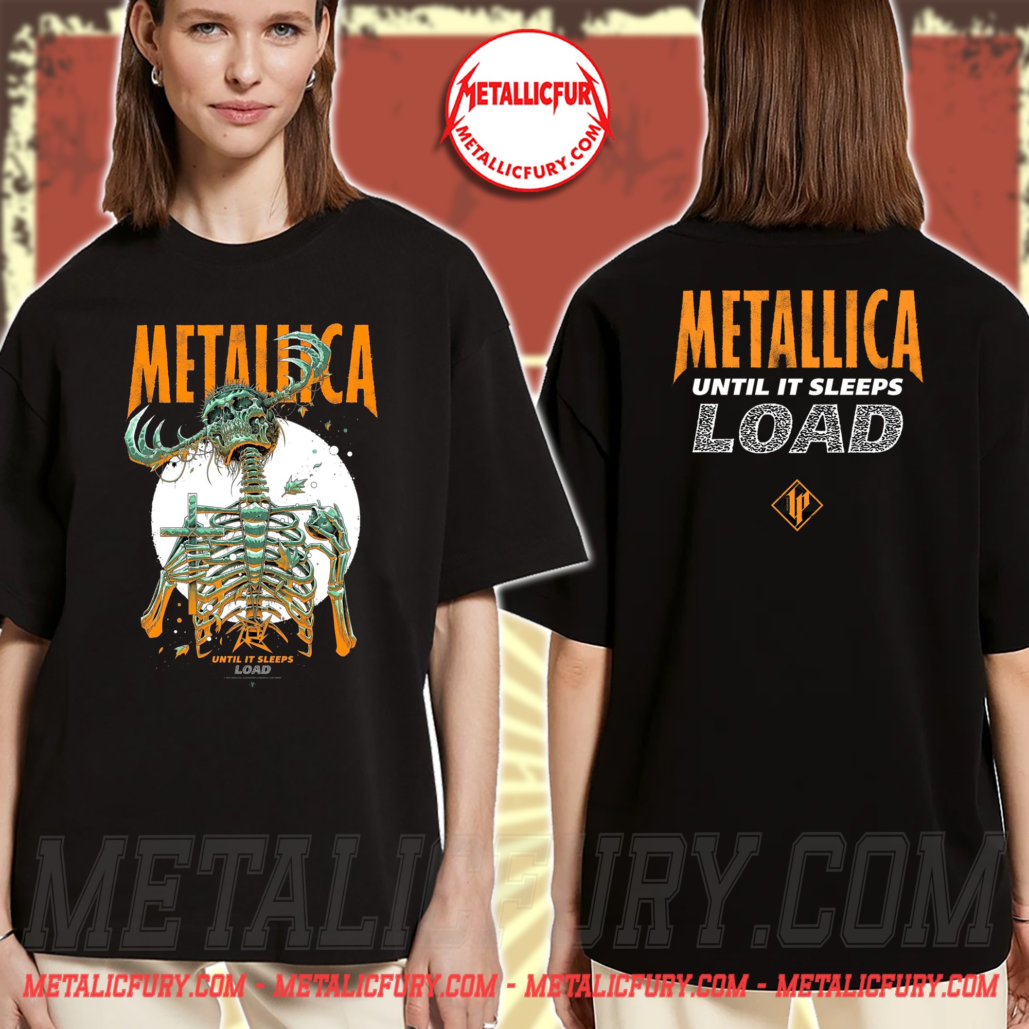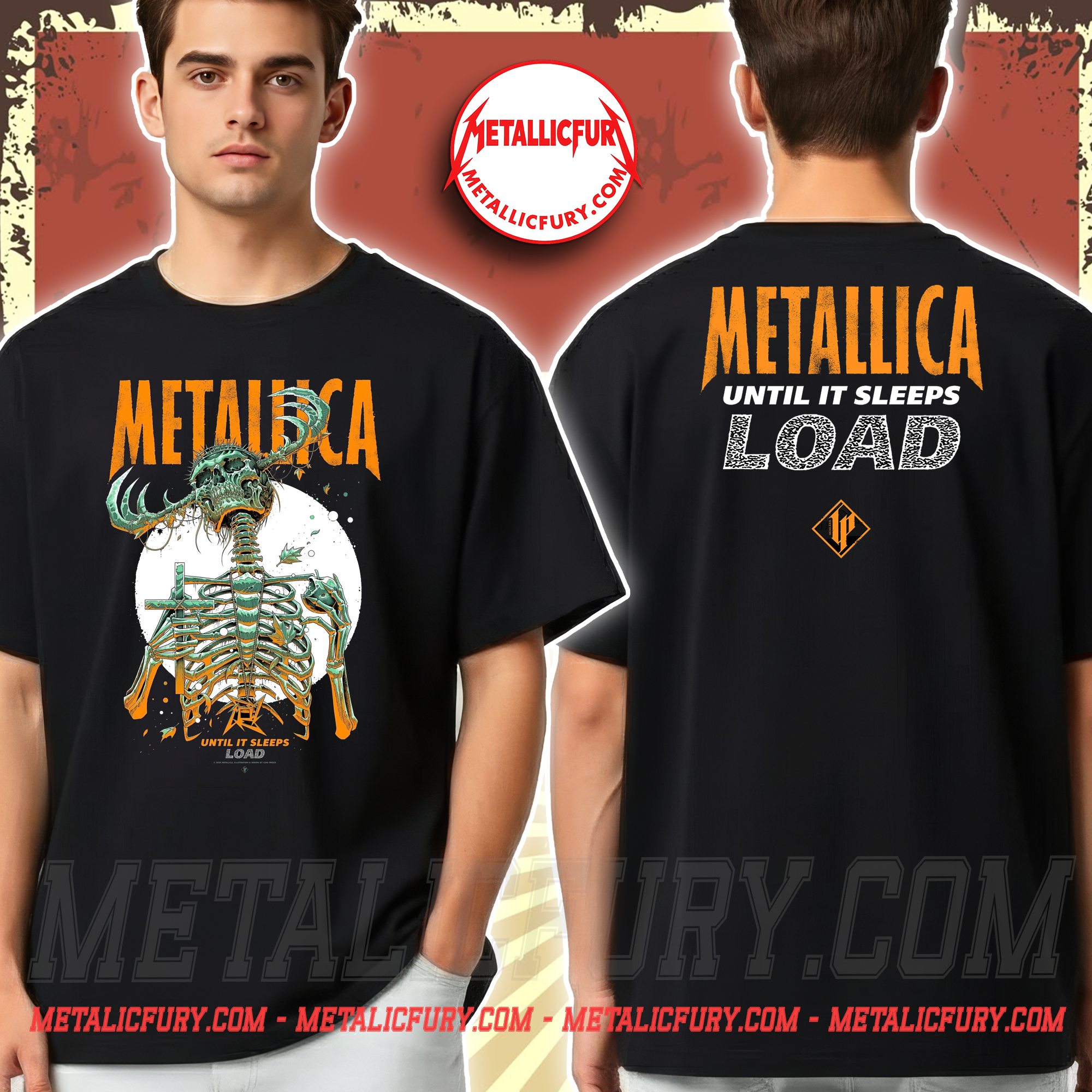 Inspired by the groundbreaking Load era, this design centers on the “Until It Sleeps” theme through the lens of Luke Preece’s signature illustration style. The front of the tee features a strikingly detailed stylized skeleton, rendered in high-contrast tones of burnt orange and teal green against a deep black canvas. Subtle details like falling leaves and a lunar backdrop create a dark, atmospheric vibe that perfectly captures the Gothic Rock essence of the mid-90s.
