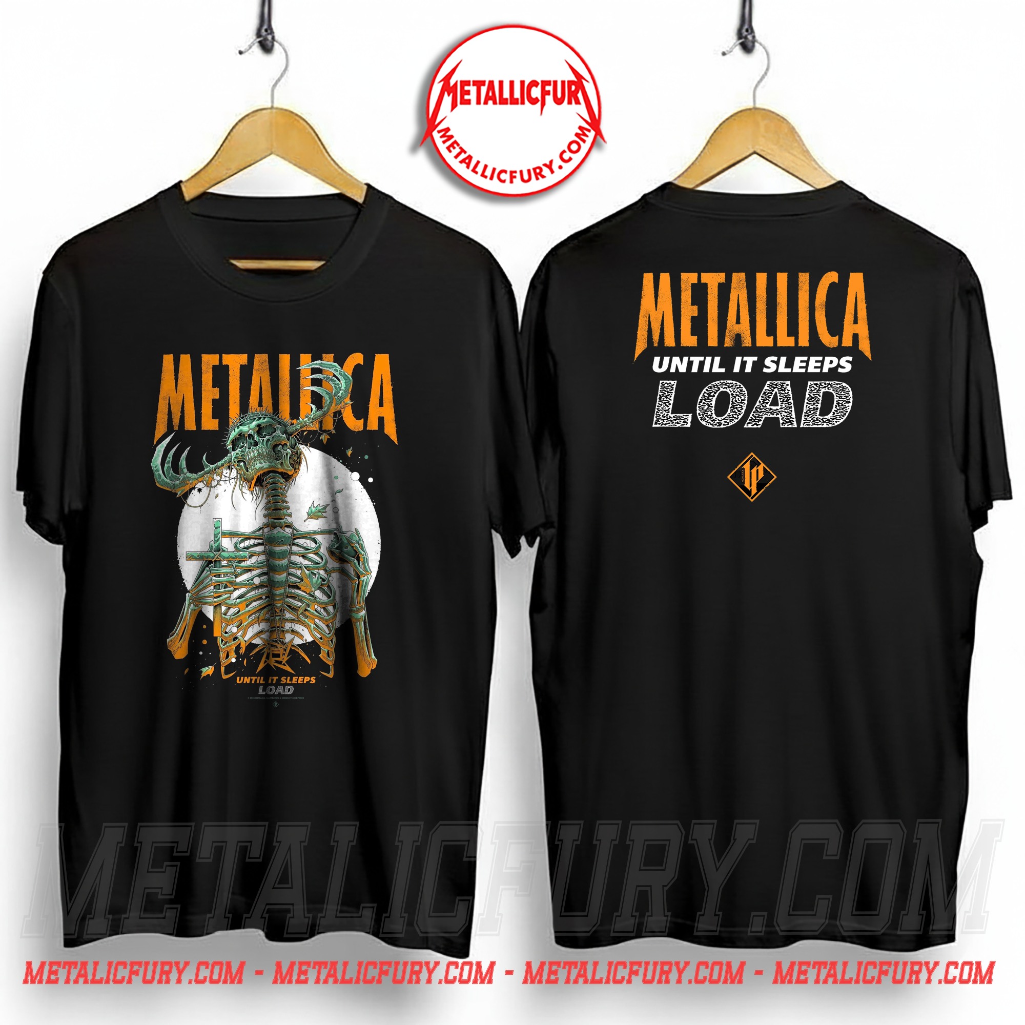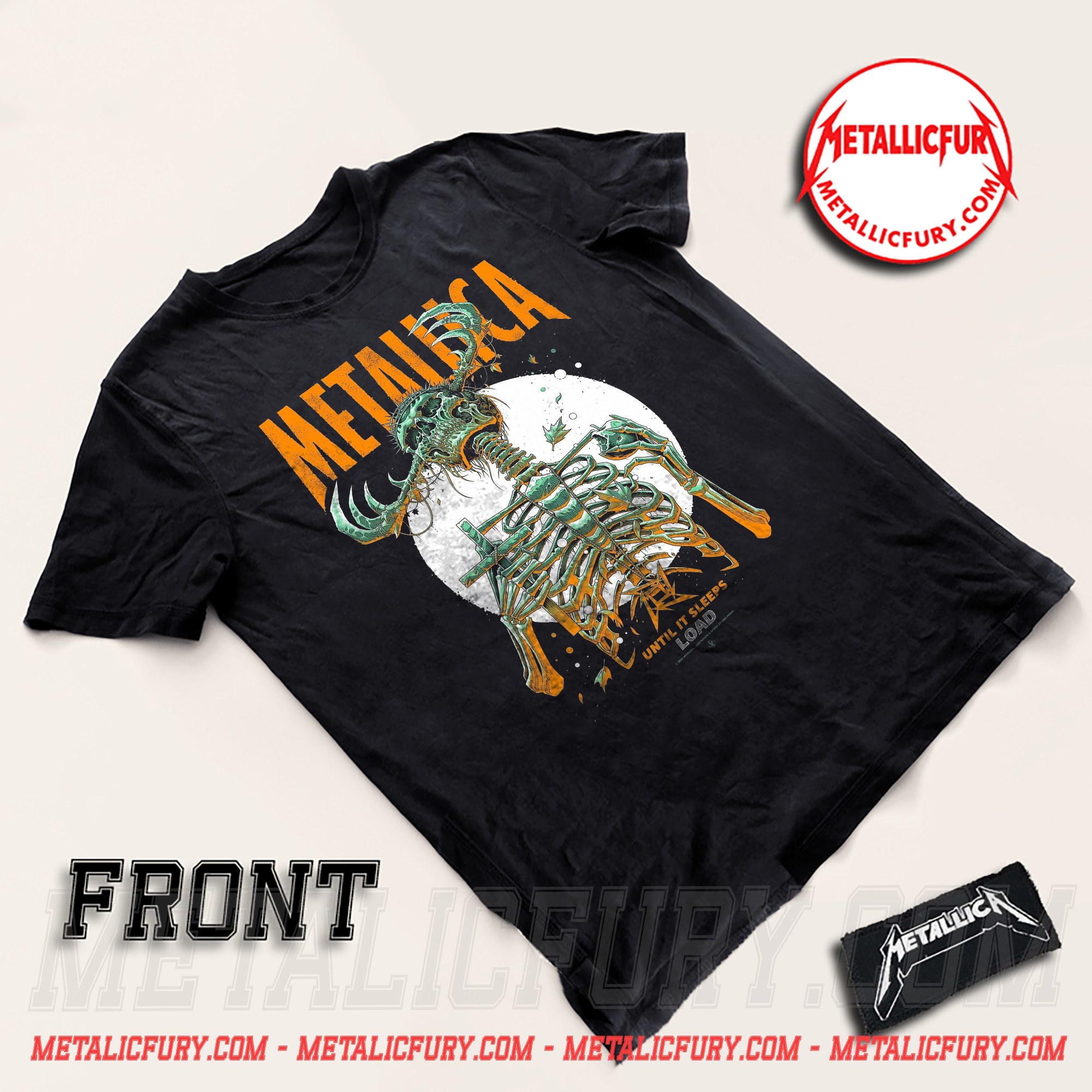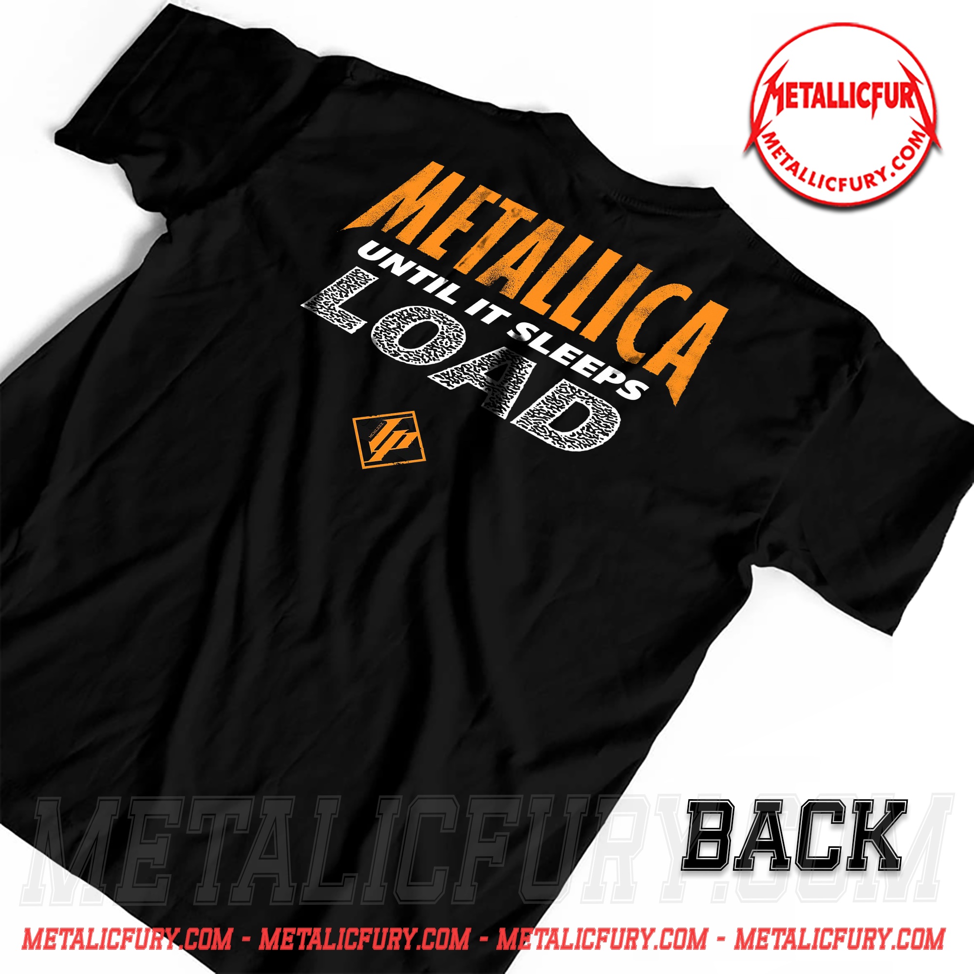 The back of the shirt makes a bold statement with the METALLICA UNTIL IT SLEEPS typography and the iconic LOAD pattern logo. A specialized diamond “LP” emblem is featured at the center, serving as a hallmark of this artistic collaboration and ensuring the design looks professional from every angle.