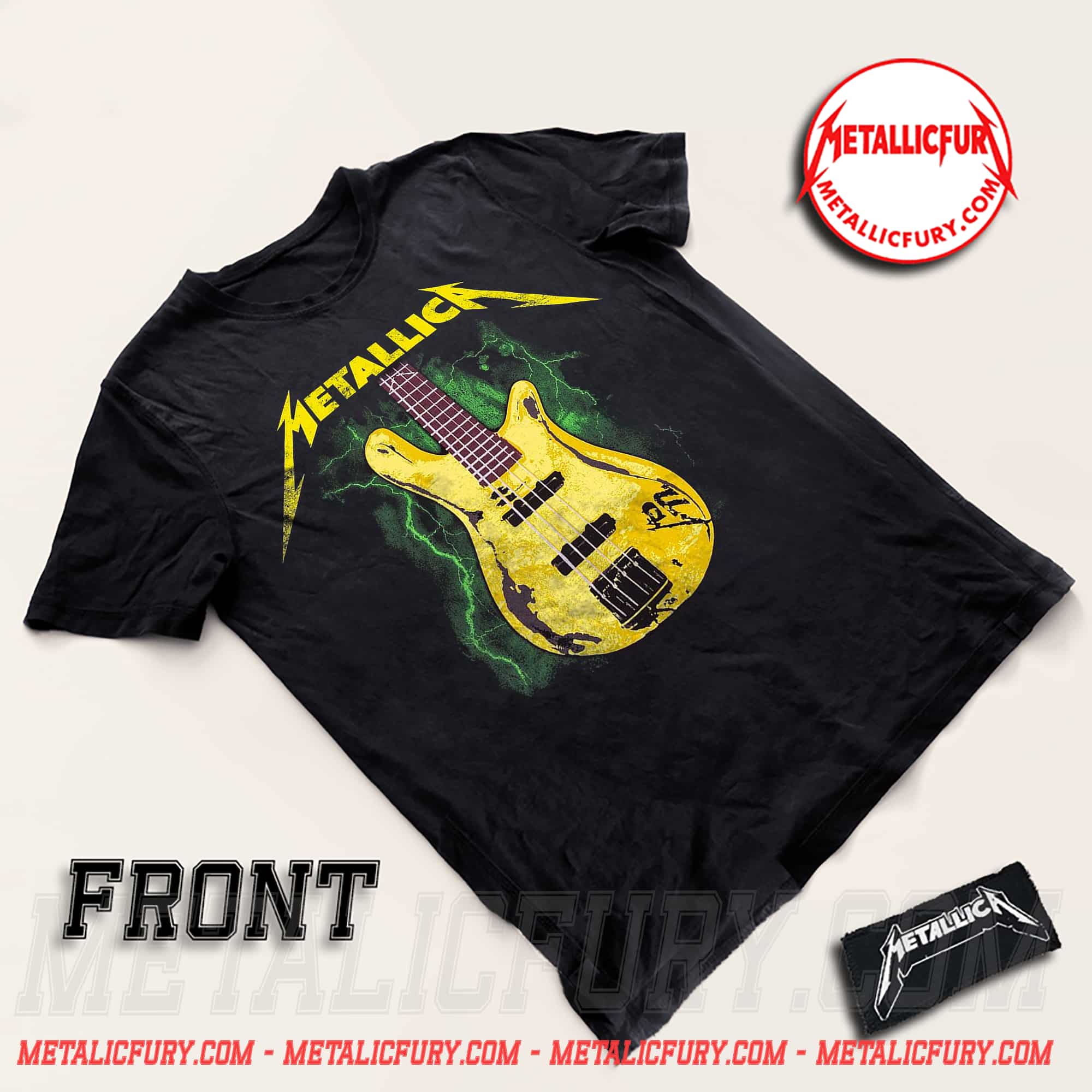 But what truly makes this shirt a standout in the realm of alternative rock streetwear is its explosive backdrop. Blazing neon green lightning bolts erupt from behind the bass, creating a fierce, eye-catching color contrast against the classic black fabric. Topped with the iconic, razor-sharp Metallica logo in a matching vibrant yellow, this custom artwork captures that electric vibe while offering a completely unique twist. It perfectly embodies the aggressive, fast-paced spirit of thrash metal band merchandise.