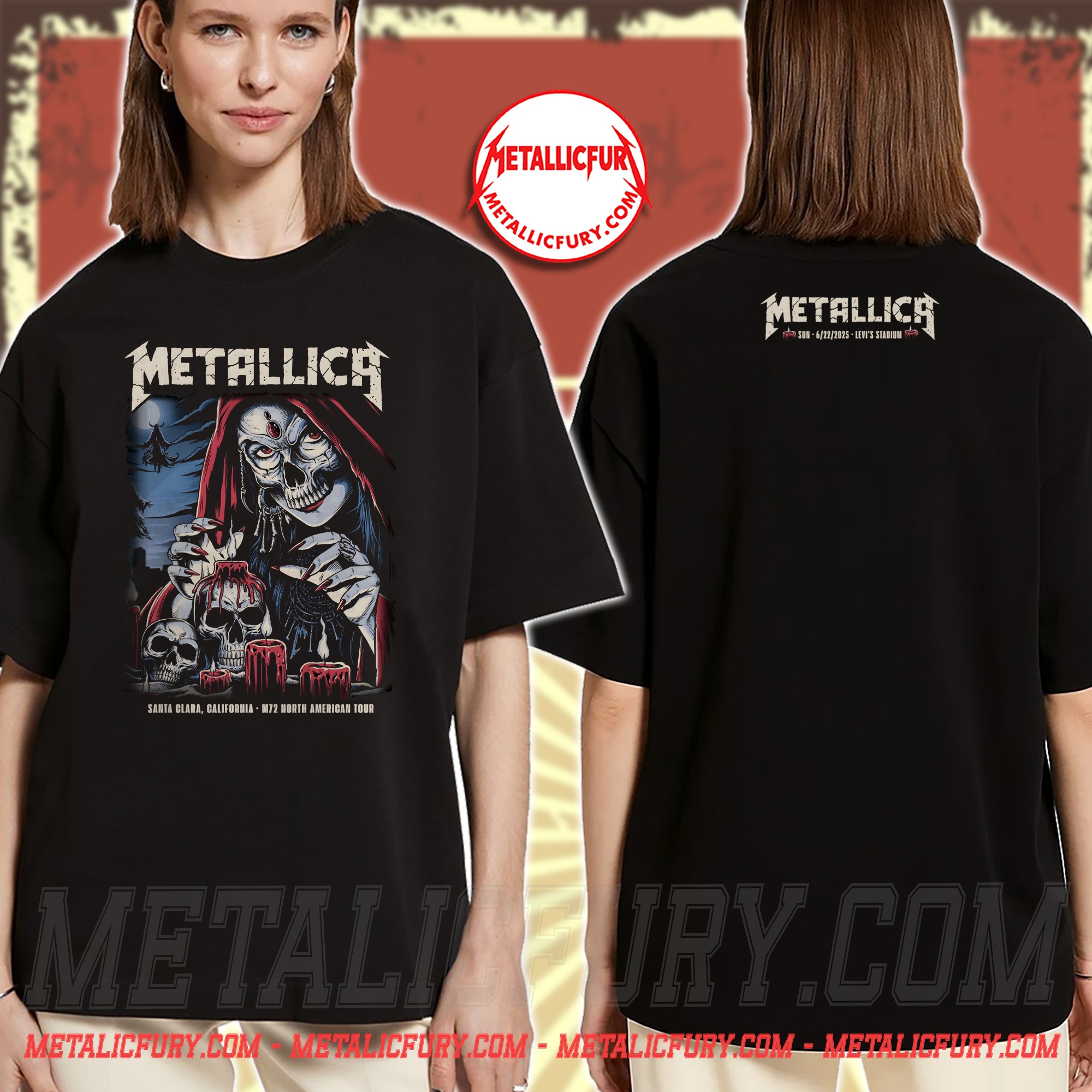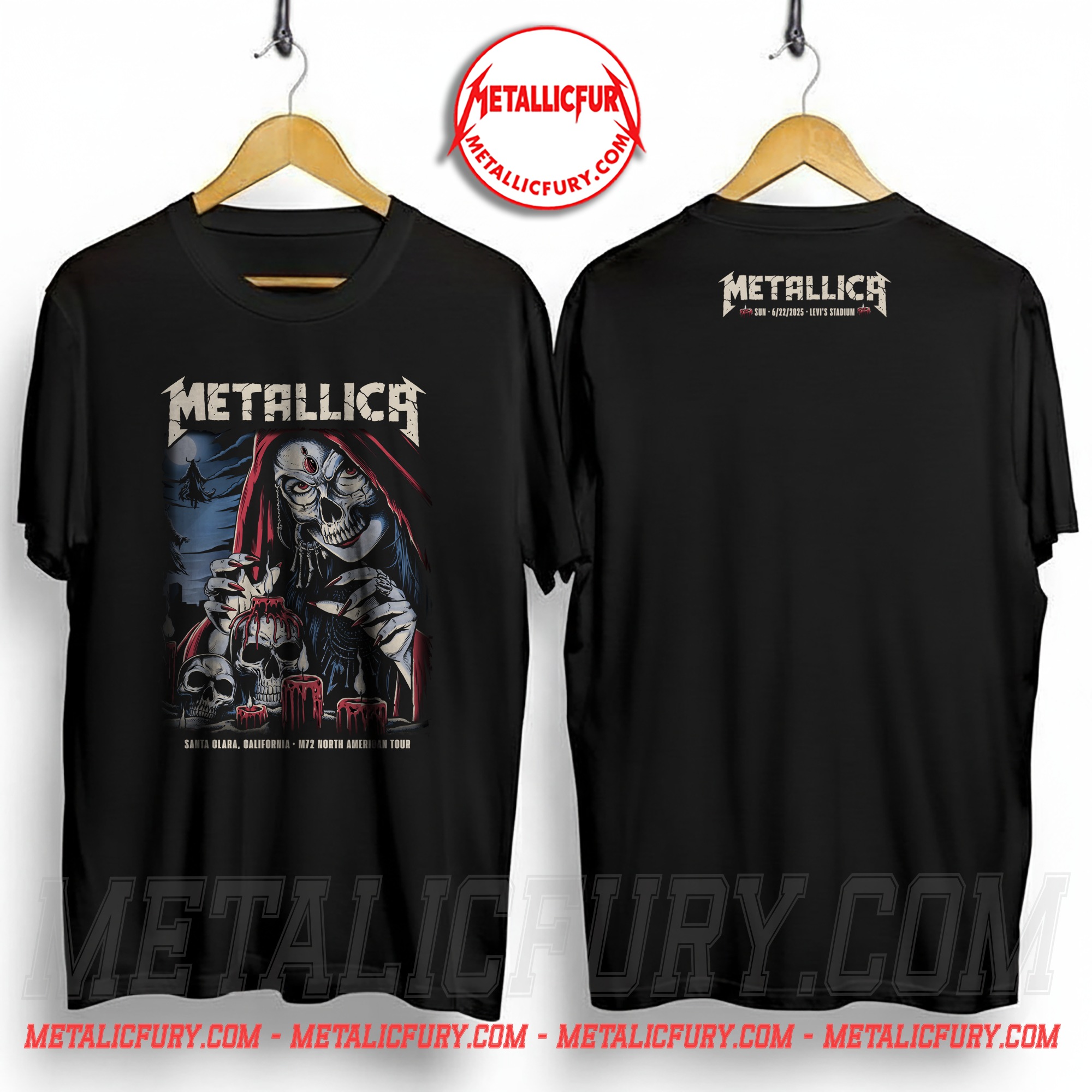 While Night 1 set the stage, Night 2 closed the weekend with a darker, more mystical energy. This t-shirt captures that atmosphere perfectly with its specific event artwork. The front features a chilling, high-definition illustration of a mystic skeletal sorceress draped in a blood-red hood. Adorned with a third-eye gem and surrounded by melting crimson candles and skulls, this design represents the aggressive yet melodic prowess of Metallica’s Sunday setlist.